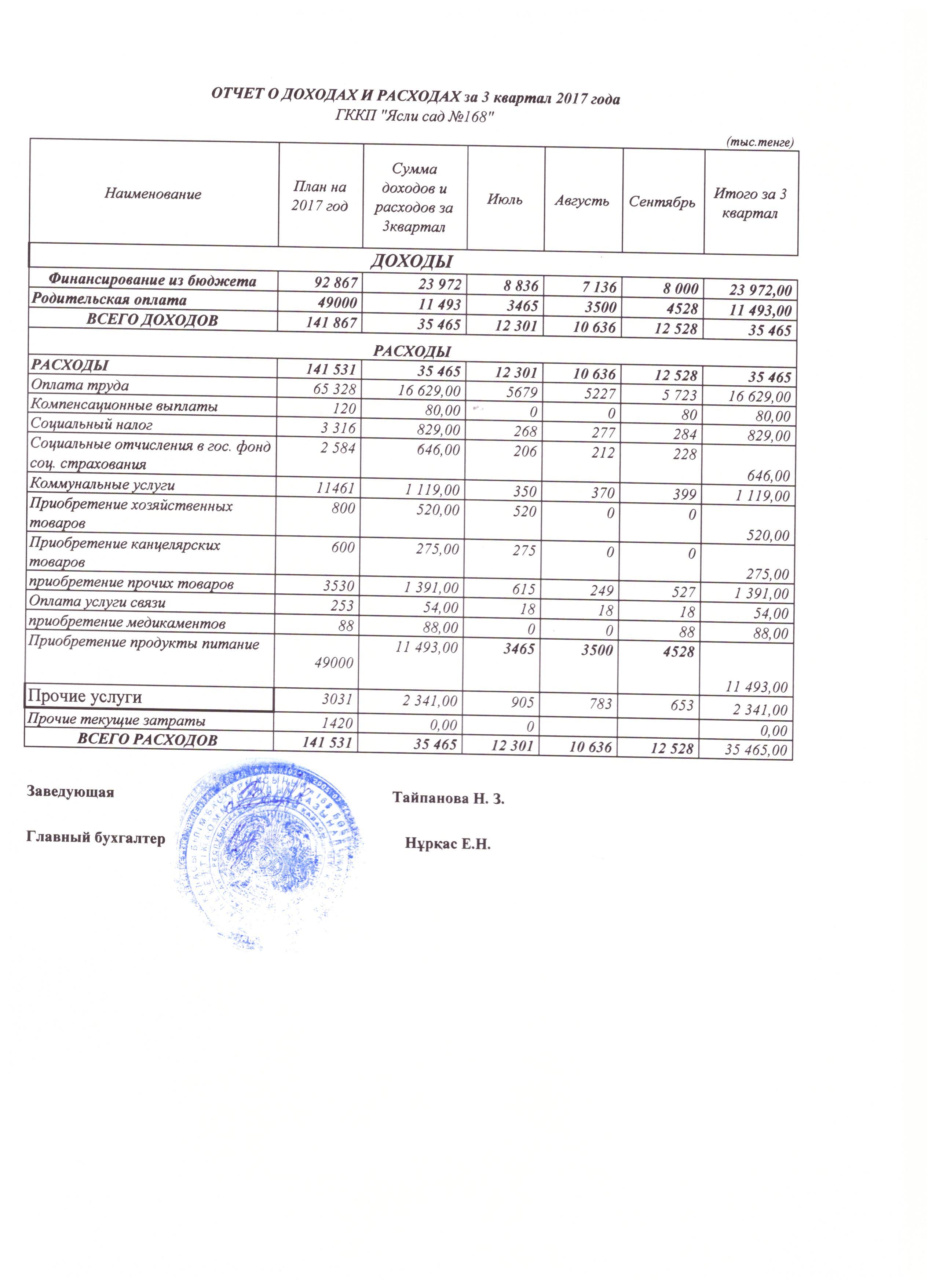 ОТЧЕТ О ДОХОДАХ И РАСХОДАХ за 3 квартал 2017 года » MКҚК «№168 бөбекжай-балабақшасы»