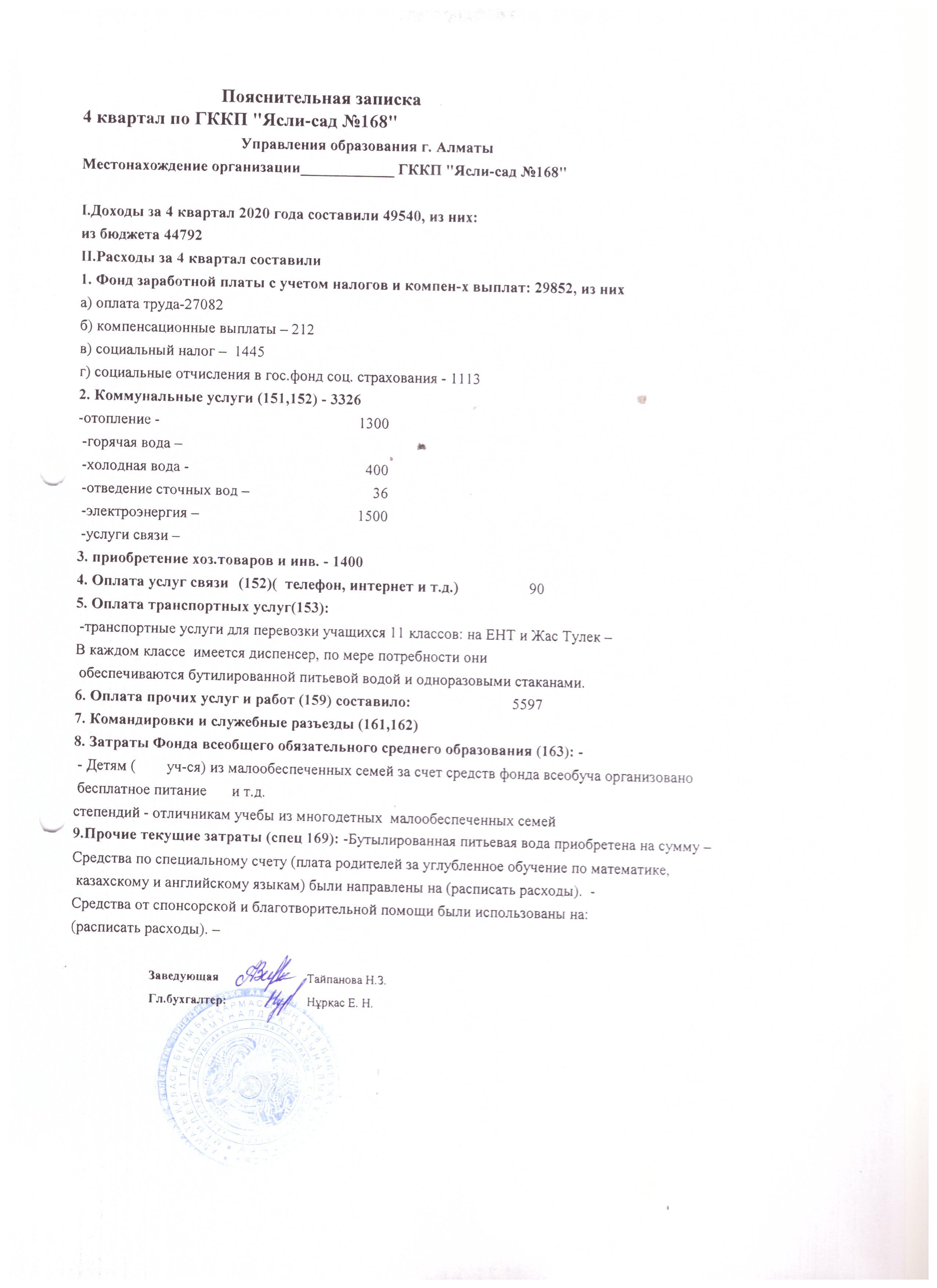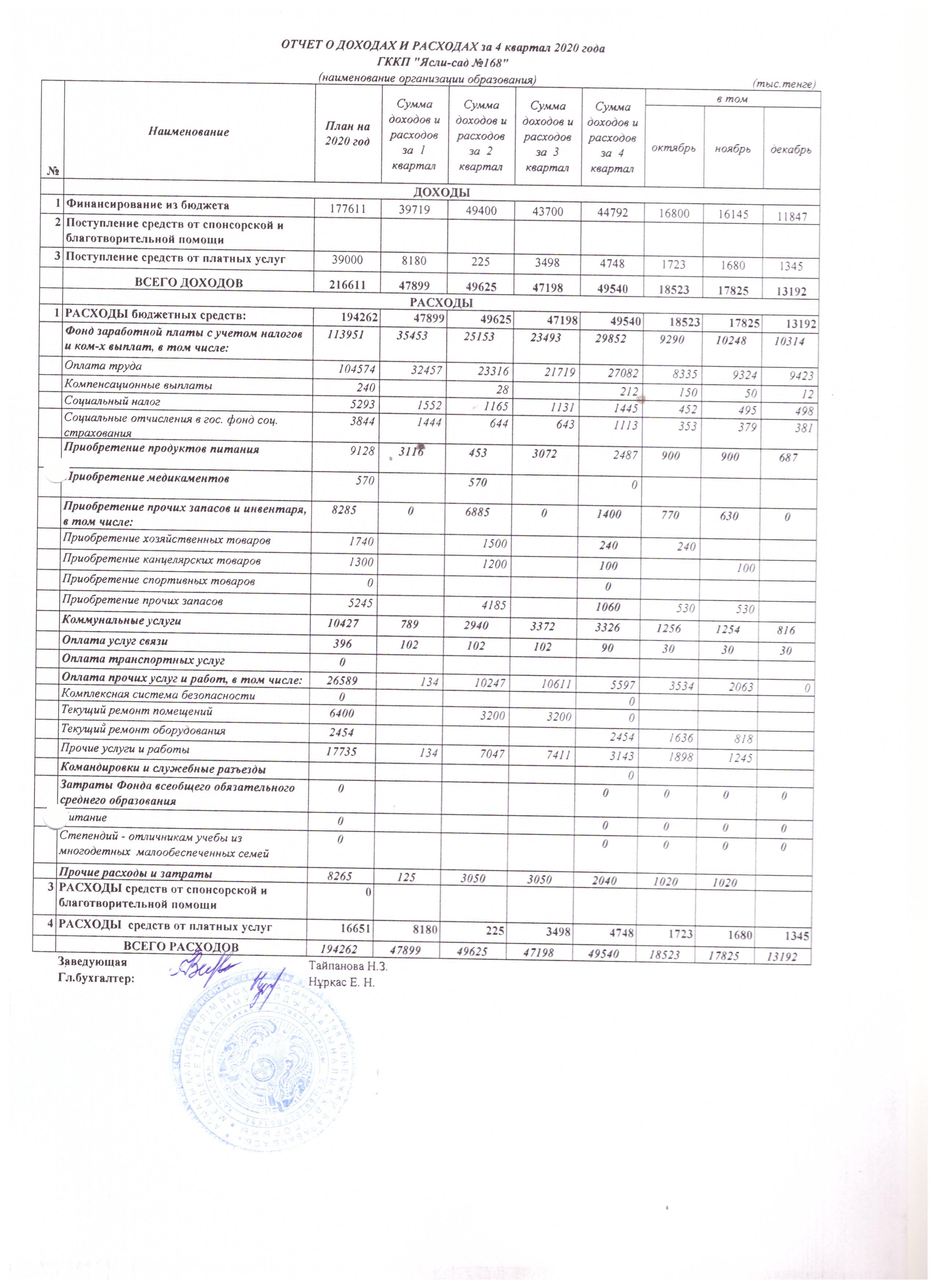4 тоқсан 2020 жылдың кіріс шығыс есебі » MКҚК «№168 бөбекжай-балабақшасы»