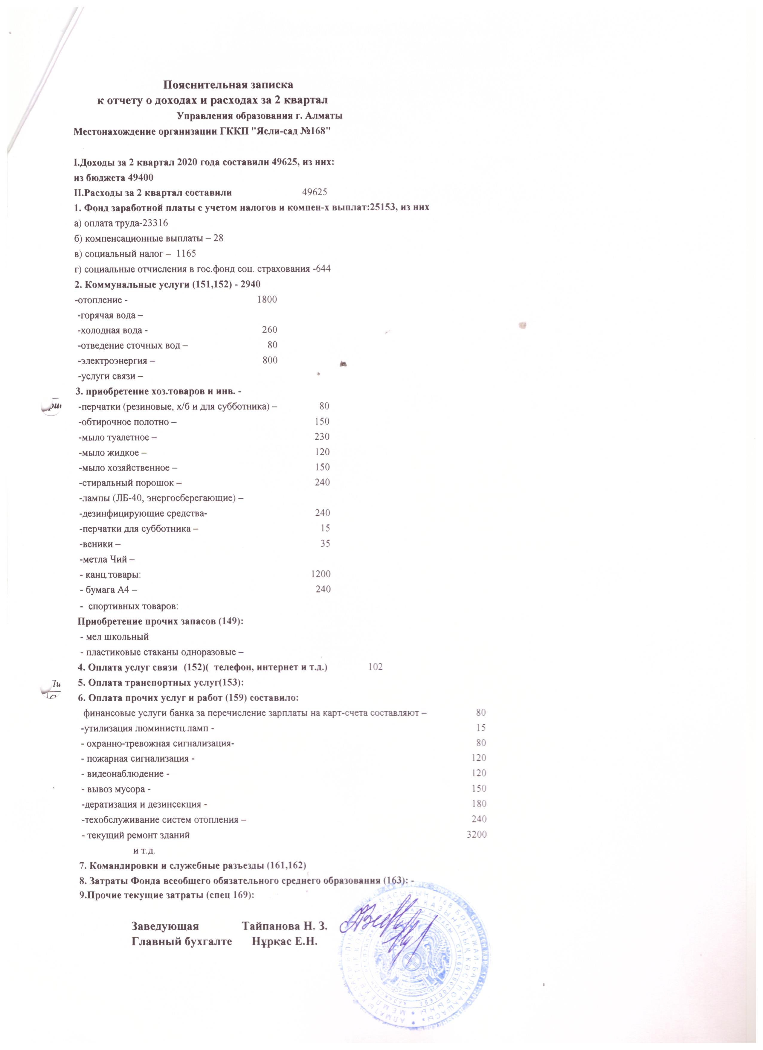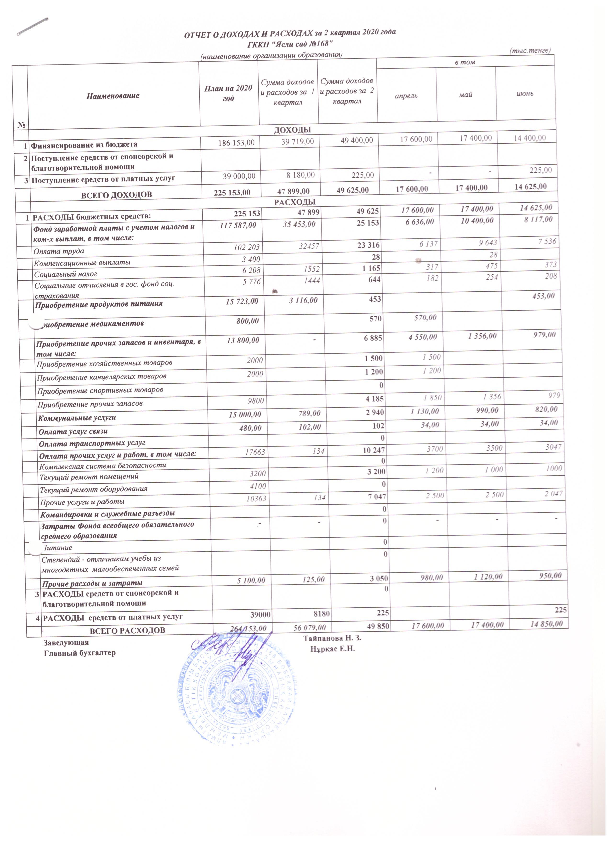 отчет о доходах и расходах 2 квартал 2020 год » MКҚК «№168 бөбекжай-балабақшасы»