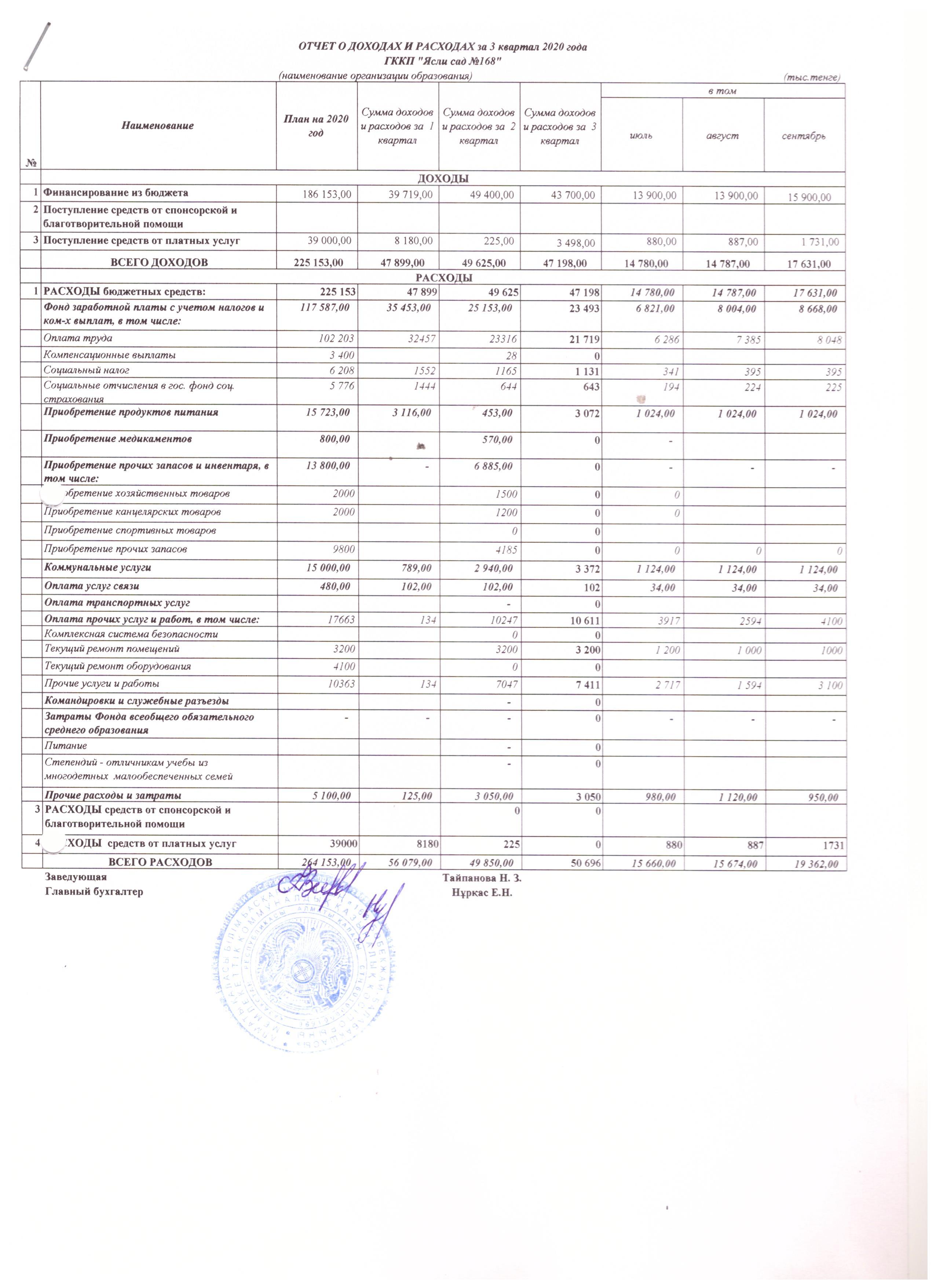 отчет о доходах и расходах 3 квартал 2020 год » MКҚК «№168 бөбекжай-балабақшасы»