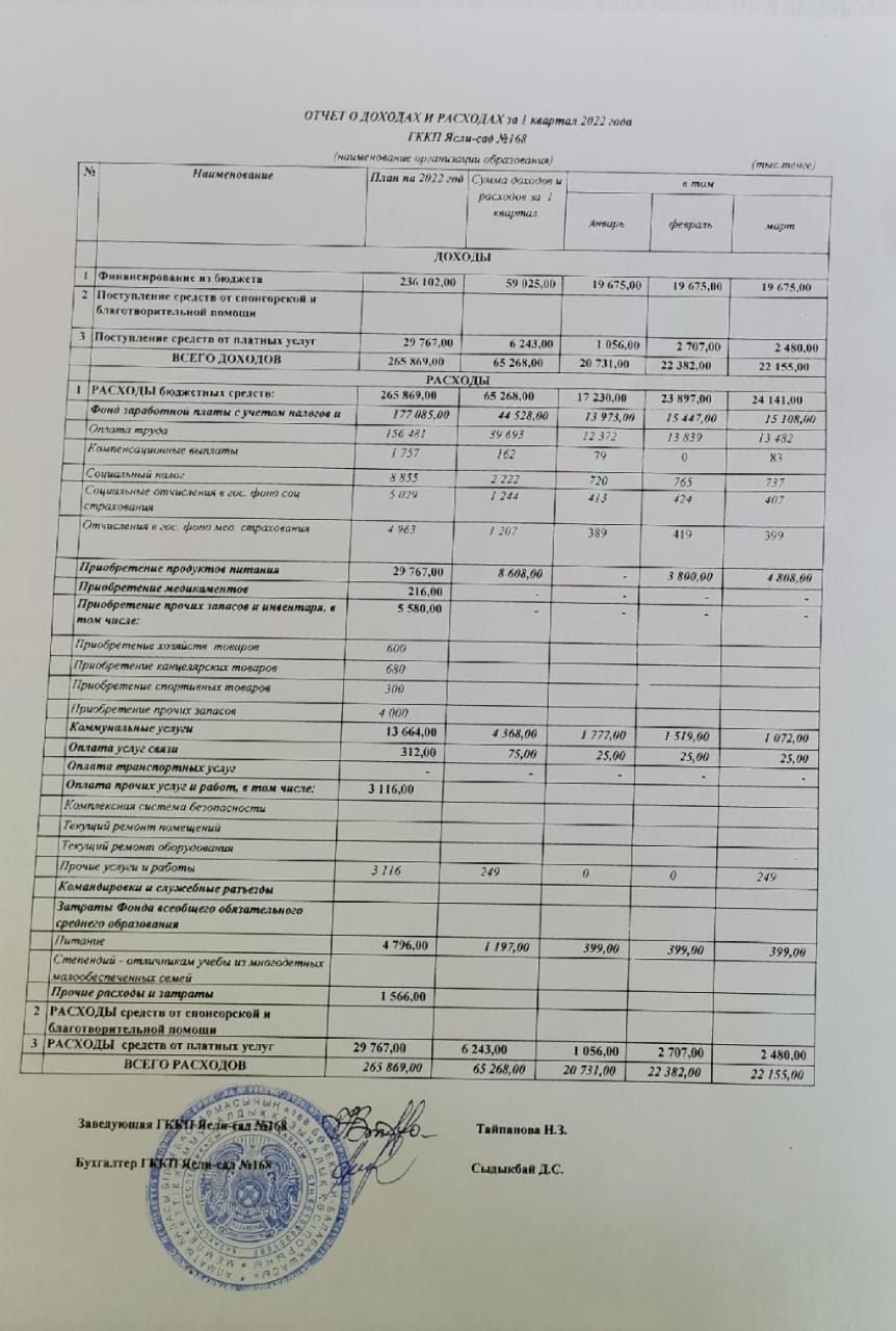 Отчет о доходах и расход 1 квартал 2022 год » MКҚК «№168 бөбекжай-балабақшасы»